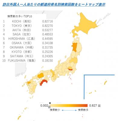 ◆上記のヒートマップは、訪日外国人一人当たりと検索数の割合を示したものである。