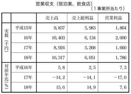 総務省はこのほど、個人経営の企業の実態を把握する「個人企業経済調査」(構造編)の、平成18年度分の結果を公表した。それによると、個人経営の宿泊業・飲食店の1事業所あたり年間売上高は1031万7千円、年間営業利益は178万6千円だった。前年に比べ、売上高は15.6%、営業利益は7.6%、それぞれ増加した。売上高、営業利益が前年を上回るのは2年ぶり。