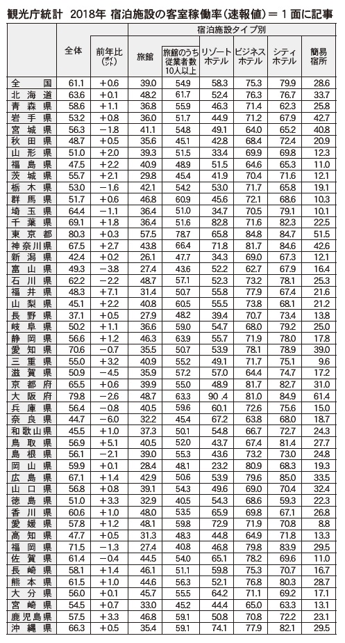18年の客室稼働率を施設タイプ別に見ると、シティホテルが前年比0.4ポイント増の79.9%、ビジネスホテルが同増減なしの75.3%、リゾートホテルが同0.8ポイント増の58.3%、旅館が同1.5ポイント増の39.0%(従業者数10人以上の旅館は同増減なしの54.9%)、簡易宿所が同0.6ポイント増の28.6%。