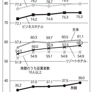 同調査の客室稼働率は、全国の全ての宿泊施設における推計値。旅館業法の許可施設数(厚生労働省の統計)は、18年3月時点で旅館が3万8622軒、ホテルが1万402軒、簡易宿所が3万2451軒。