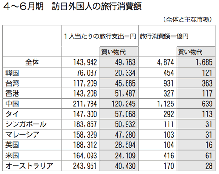1人当たりの旅行支出の平均は前年同期比5.7%増の14万3942円で、このうち買い物代は同6.2%増の4万9763円。市場別では、中国が旅行支出21万1784円のうち買い物代に12万245円を費やしている。他の国・地域の買い物代は、タイが5万7068円、香港が5万1487円、台湾が4万5665円、米国が2万4109円、韓国が2万334円など。